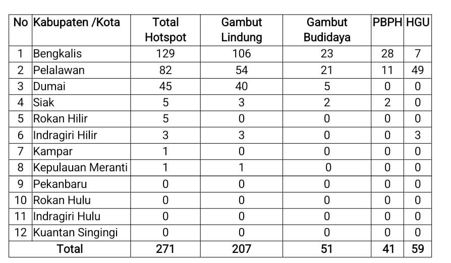 Data BMKG menyebutkan, sebaran titik panas di Riau paling banyak terpantau di Kabupaten Bengkalis dengan 118 titik, diikuti Kabupaten Pelalawan sebanyak 107 titik. Sementara itu, wilayah lain juga menunjukkan angka yang mengkhawatirkan, seperti Kabupaten Indragiri Hilir dengan 35 titik, Kota Dumai 23 titik, Kabupaten Rokan Hilir 8 titik, Kabupaten Indragiri Hulu 7 titik, serta masing-masing 2 titik di Kabupaten Siak dan Kepulauan Meranti. Titik panas merupakan indikator awal yang menunjukkan potensi kebakaran hutan dan lahan (karhutla), namun tidak seluruhnya dapat langsung dikonfirmasi sebagai kejadian kebakaran di lapangan. Meski demikian, tingginya jumlah titik panas di Riau saat ini menunjukkan adanya peningkatan risiko dan indikasi awal terjadinya karhutla di sejumlah wilayah, yang berpotensi berkembang menjadi kondisi darurat apabila tidak segera ditangani.