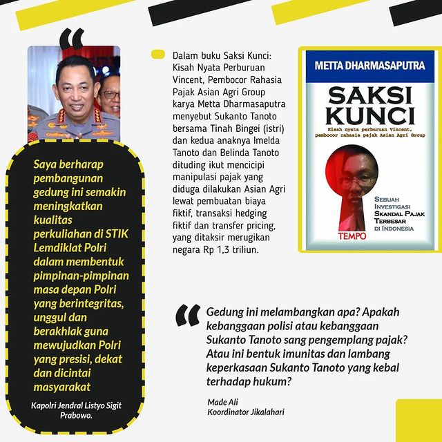 “Gedung ini melambangkan apa? Apakah kebanggaan polisi atau kebanggaan Sukanto Tanoto sang pengemplang pajak? Atau ini bentuk imunitas dan lambang keperkasaan Sukanto Tanoto yang kebal terhadap hukum?” kata Made Ali, Koordinator Jikalahari.