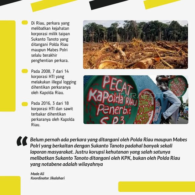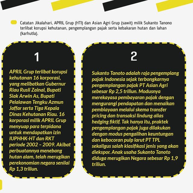 Catatan Jikalahari, APRIL Grup (HTI) dan Asian Agri Grup (sawit) milik Sukanto Tanono terlibat korupsi kehutanan, pengemplangan pajak serta kebakaran hutan dan lahan (karhutla).
